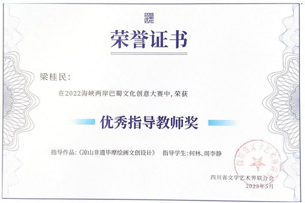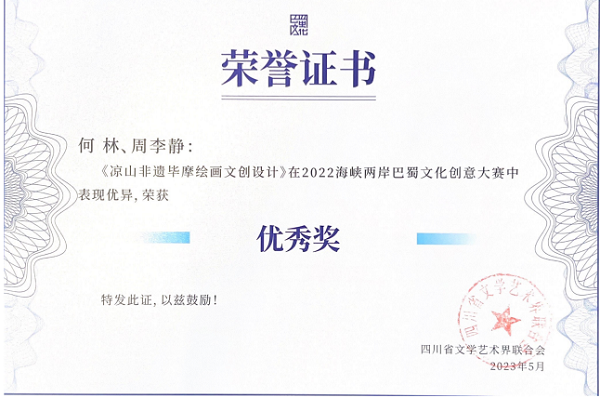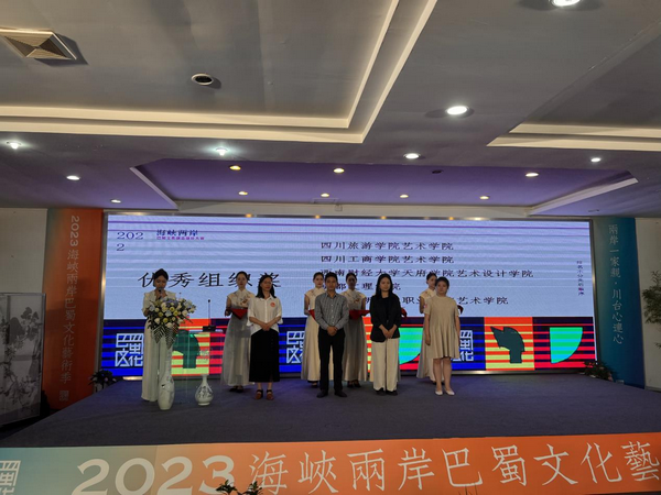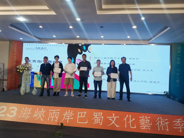 开幕式的第一个议程是2022海峡两岸巴蜀文化创意设计大赛颁奖典礼。2022海峡两岸巴蜀文化创意设计大赛经历了新冠疫情最艰难的时间段,组委会克服各种困难和干扰,经过三轮评比,最后在一千多件作品评选出6个优秀奖(不设等级奖)。四川工商学院艺术学院何林、周李静同学的《凉山非遗毕摩绘画文创设计》作品脱颖而出获优秀奖。梁桂民老师获得优秀指导教师奖,四川工商学院艺术学院获得优秀组织奖。